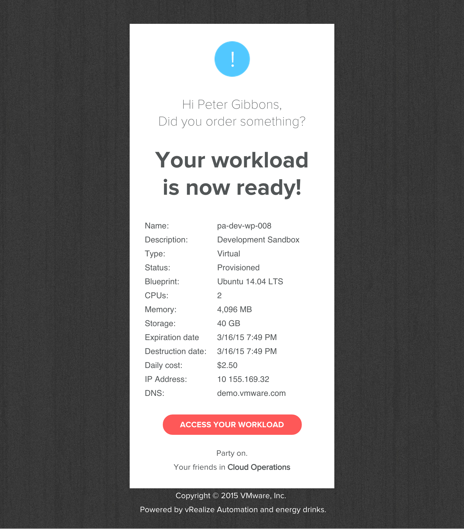 The messages that appear in the inbox of the user are part of the experience. VMware vRealize Automation can send automatic notifications for several types of events, such as, the successful completion of a catalogue request or a required approval workflow. System Administrators can configure global email servers, senders and recipients that process email notifications.