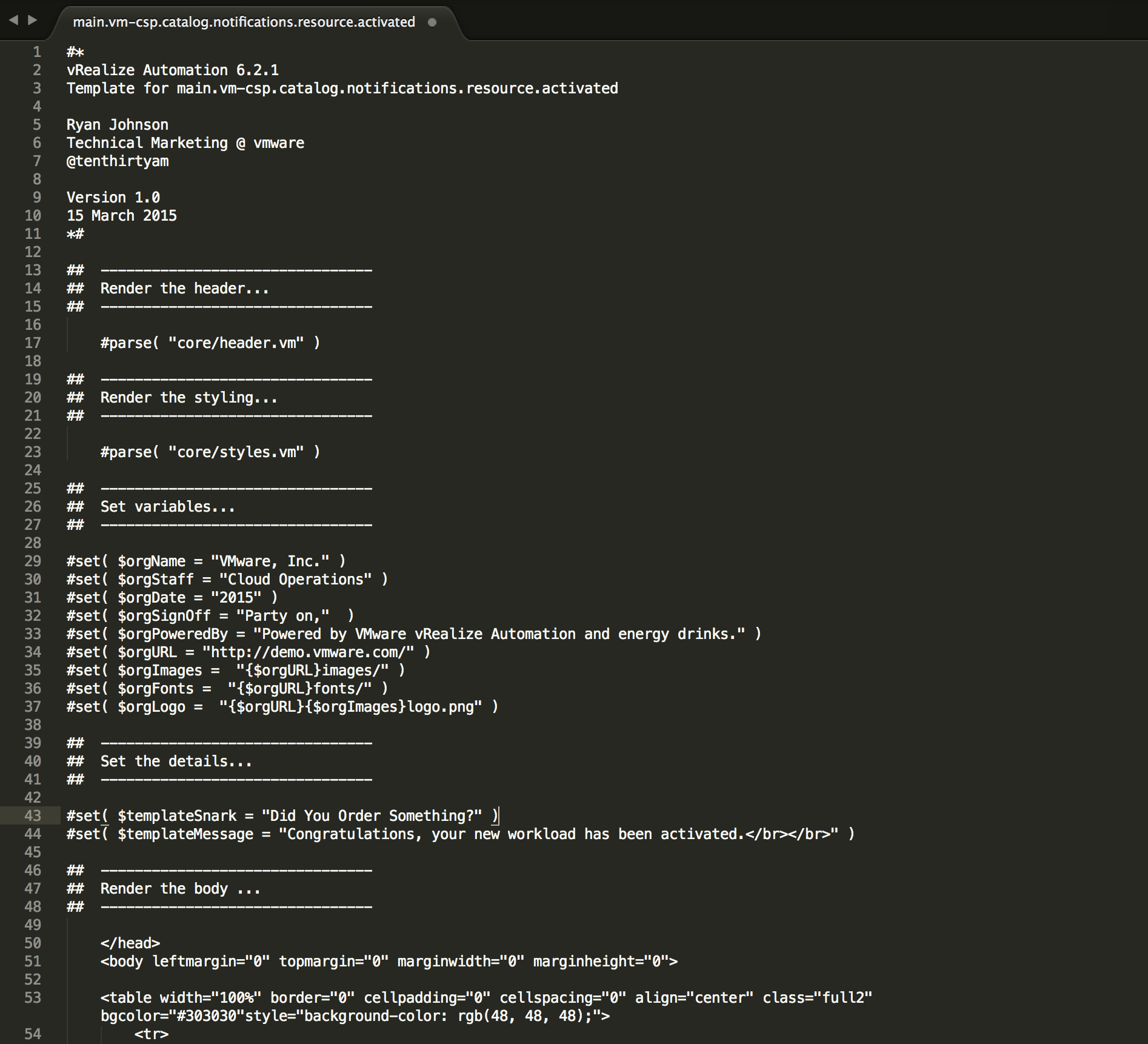 vRealize Automation uses a folder structure to determine the appropriate template to user based on the context of the tenant. Templates files are written in Apache Velocity, an easy to use Java-based template engine. Learn more about the simple directives used in the .vm template files in the Apache Velocity User Guide.