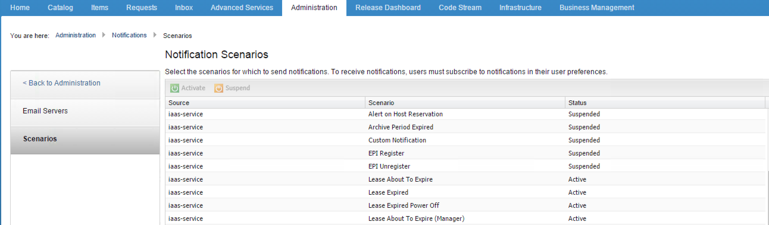 Tenant Administrators can override those defaults, or add their own servers, senders and recipients if no global attributes are specified. They may even select which events will cause notifications to be sent to their users. Each component, such as the service catalog or infrastructure-as-a-service, can define events that can trigger notifications.
