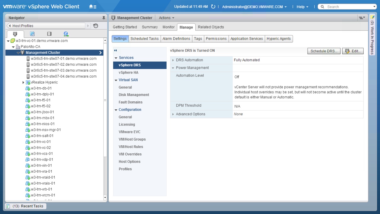 As mentioned previously, DPM leverages DRS when to migrates virtual machines away from hosts that are ready to be powered-off and marked as stand-by. Therefore, DPM requires that DRS to be enabled on all clusters in which it is enabled. Let's look at how to enable DPM in this Management Cluster.