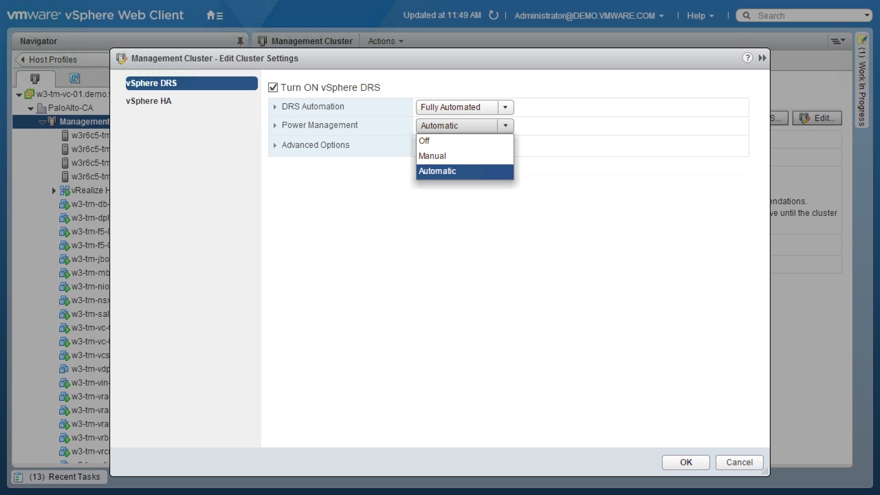 - Enable DPM by clicking Edit and selecting either [Manual] or [Automatic]. In [Manual] mode, execution of DPM recommendations requires administrative intervention while [Automatic] mode, executes DPM recommendations without administrative intervention.