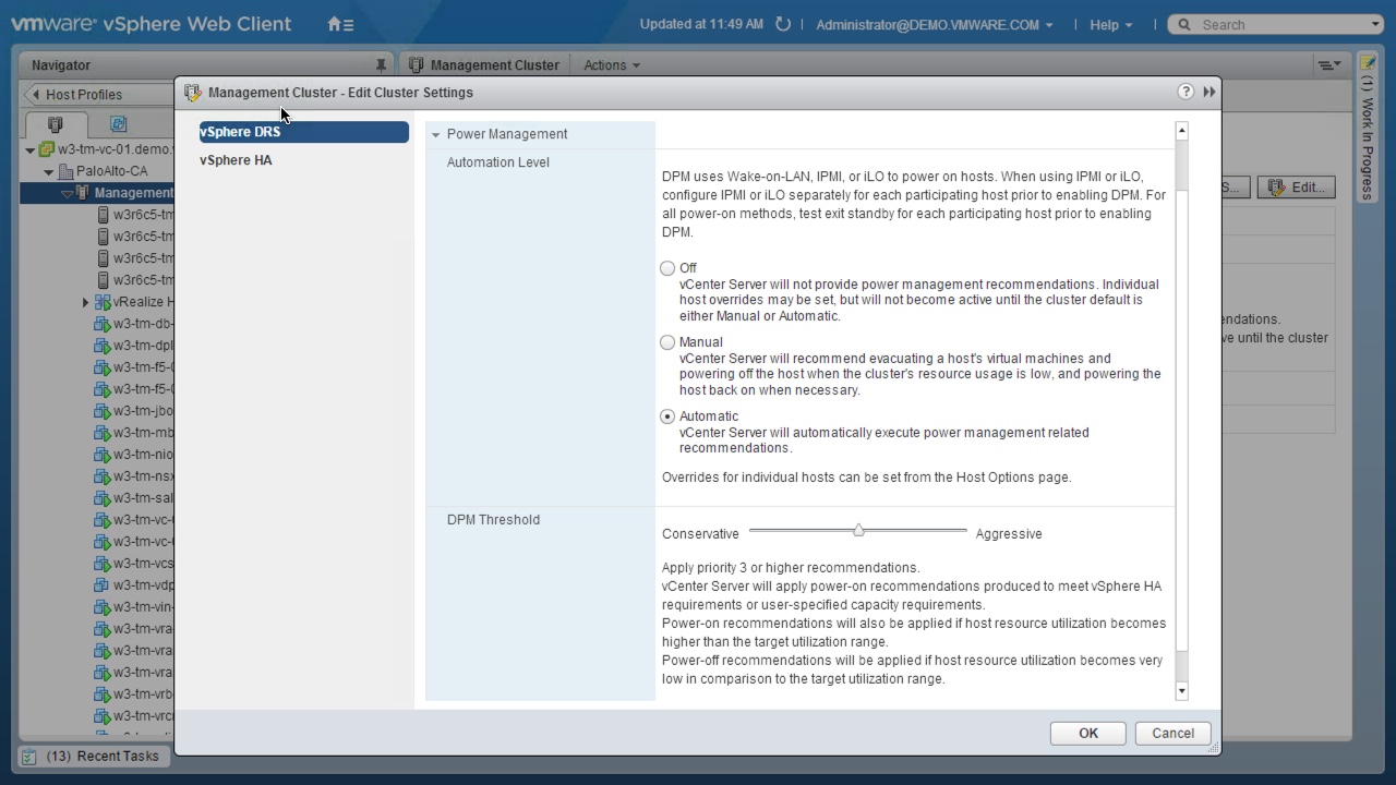vSphere Distributed Power Management is now enabled, but can also adjust the DPM Threshold to suit our requirements.