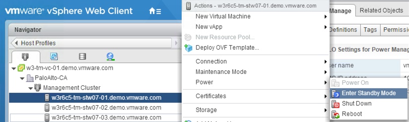 - Test placing host in standby mode by right-clicking the host in the vSphere Web Client. The select Power > Enter Standby Mode to initiate standby.