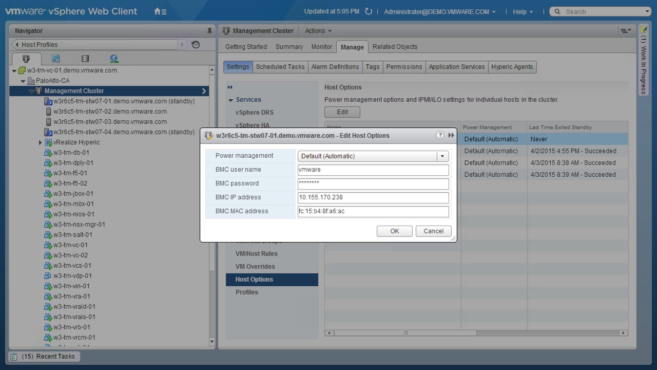 Before enabling Power Management for hosts in a vSphere cluster, it is necessary to gather the username and password for IP and MAC Address of the BMC.
