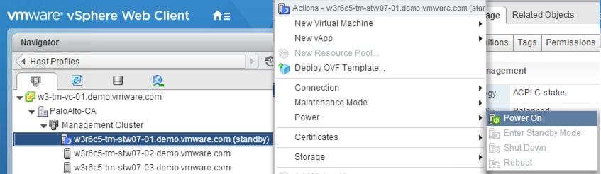 - Test exiting standby mode by right-clicking the host in the vSphere Web Client. The select Power > Power On to initiate power-on.